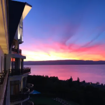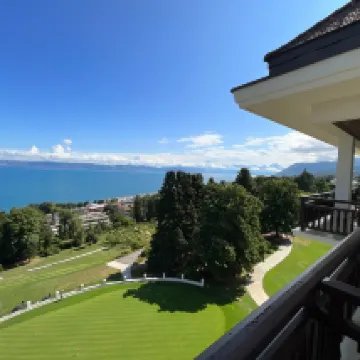 Останавливались в этом отеле на четыре ночи в мае. Забронировали номер residence lake view. Из окон открывается красивый вид на Женевское озеро. Если нужна солнечная сторона то нужно бронировать номер с видом на парк. В отеле два больших бассейна открытый и закрытый. Очень понравилась зона с различными видами гидро массажа. На завтрак предлагается французское шампанское. В отеле находится прекрасный ресторан для гурманов. Рядом находится поле для гольфа.