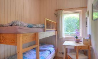 Holiday village "Ferienpark Extertal". 150 houses in the resort. In the district of Rott 10 km from the centre of Extertal, 17 km from the centre of Hameln, outside the resort, in a quiet, sunny position, along the wooded area. Stepped path (21 steps) to the house. Shop 7 km, grocery 7 km, supermarket 7 km, restaurant 7 km, bus stop 200 m, railway station "Rinteln" 11 km, outdoor swimming pool 10 km, indoor swimming pool 10 km. Golf course (18 hole) 19 km, riding stable 15 km. Well-known lakes can easily be reached: Doktorsee 12 km. Please note: car recommended. Walking and hike trails at departure of the park. The park is located on the edge of the nature reserve and typical Scandinavian wooden houses are in. "Wiesenhütte", 4-room house 70 m2, on the ground floor. Tasteful and cosy furnishings: living/dining room with Scandinavian wood stove and satellite TV (flat screen). Exit to the terrace. 2 rooms, each room with 1 double bed. 1 children's room with 1 x 2 bunk beds (80 cm, length 190 cm). Kitchenette (oven, 4 ceramic glass hob hotplates, toaster, kettle, microwave, electric coffee machine). Shower/WC. Electric heating. Terrace roofed, patio, garden. Terrace furniture, barbecue, conservatory. Beautiful view of the countryside. Facilities: washing machine, children's high chair, baby cot (extra). Internet (WiFi, free). Parking at the house. Please note: non-smoking house. Maximum 1 pet/ dog allowed. Parking access to the holiday house by 21 steps. Bookings accepted for holiday purposes only.