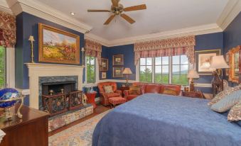 Inside the elegant country home are spacious rooms furnished with oriental rugs, antiques, huge stone fireplaces, books galore, with deep chairs and sofas for leisurely pursuits. All 5 of Wintersun's bedrooms are beautifully appointed with fine furnishings, designer fabrics, lush linens, down comforters, private baths, cozy seating, and fireplaces, with fabulous views of the blue ridge mountains.