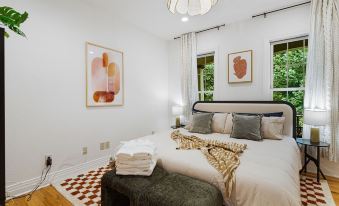 The first floor is a perfect blend of style and comfort. It features a chic dining room that seats 10, ideal for group meals. The living room is bathed in natural light, offering ample seating for relaxation. A fully stocked kitchen, equipped with all your cooking essentials, includes a kitchen table that seats 8. This floor also houses a stylish bedroom, a half bath, and an exclusive speakeasy room with a golf simulator, pool table, and shuffleboard. Step out onto the deck for outdoor seating and a hot tub.