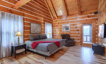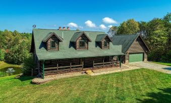Plan your Hocking Hills getaway at Timber Ranch. This beautiful hand hewn log home offers plenty of seclusion with wooded nature views on 43 acres of property including a catch and release pond. Bring your fishing poles and your pet! Pet friendly with 3 private bedrooms plus sleeping loft and 3.5 baths. Comfortably accommodates up to 12 guests. Less than 5 miles from Route 33 and downtown Logan. Centrally located to the state parks and local area attractions. First floor master suite with King size bed, en-suite bath with soaking tub, and access to the screened in porch to enjoy your morning coffee with wooded and pond views. The loft bedroom is perfect for the family with two sets of twin over twin bunks and a children's play area. The finished lower level offers two additional bedrooms each with a Queen and twin bed. First and second floors have large stone wood-burning fireplaces. Enjoy the well equipped kitchen with JennAir appliances to prepare your meals. Relax after hiking with a soak in the private hot tub with outdoor patio seating. Timber Ranch offers complimentary WiFi and three flat screens with Roku in the great room, finished lower level, and Master bedroom. This is a restful retreat for friends and families to enjoy in the Heart of the Hocking Hills.
