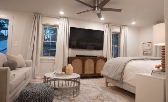 The newly remodeled Stadium Cottage is a light-filled studio home with a plus one bedroom with twin bed and a Queen pullout. The original floors and stylish design are only surpassed by its location. You will wake up in the shadow of Razorback Stadium. With a king bed, twin in the back mini bedroom, and a fold out full, you and up to four close friends can have a magical weekend in Fayetteville. A charming back porch is the perfect place to enjoy a morning cup of coffee overlooking the UofA.