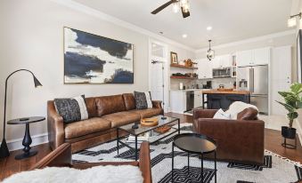 Upon opening the front door to the condo you will be greeted with an open-concept kitchen and den which makes for the perfect entertaining spot. The kitchen is fully appointed with everything you need to make the perfect meal. If cooking is not in your plans, then a simple walk downstairs to Theo's Dining Room and Lounge is the perfect alternative. Theo's Dining Room & Lounge blends Modern American cuisine with the comfort of Southern Hospitality.
