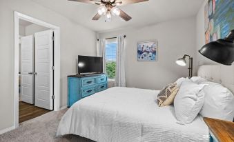 Upstairs you will find the primary bedroom has a cozy king size bed, plenty of floor space, a large walk in closet with dedicated workspace and private en suite bathroom. Bedroom 2 & 3 are also located upstairs and each have queen size beds and smart TVs as well as plenty of closet and dresser storage. These bedrooms share a jack-n-jill full bathroom between them. Both bathrooms upstairs have plenty of linens. Lastly, the downstairs sectional sofa has a pull out queen size bed for additional sleeping arrangements.