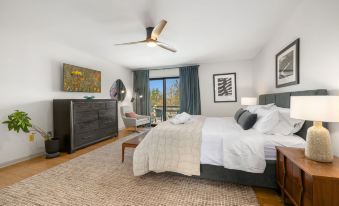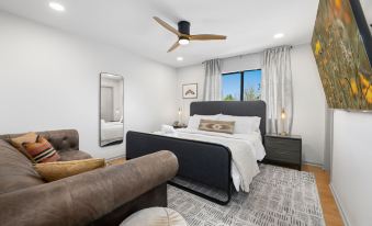 (1) The primary bedroom features a King size bed, Smart TV, freshly remodeled & high-end suite bathroom, and access to a private patio.
