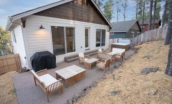 Brand new in March 2019 4 bedroom 3 bath home with New Game Room! This home is constructed with upgrades all over including tile flooring, concrete countertops, stainless steel gas appliances, tile showers, expansive glass doors, mountain views from the front porch, hot tub, and nothing but views of trees behind you! The location of our home is right next to downtown Flagstaff. If you have a large group, we also have a 3 bedroom 2 bathroom home next door!