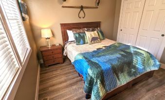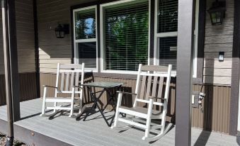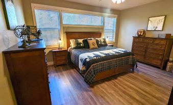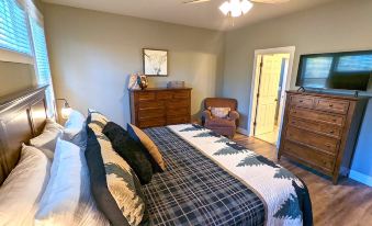 Step inside to discover a welcoming open-concept kitchen and living space, complete with comfortable seating and a 65" smart TV. The kitchen features ample dining options, including a kitchen table, outdoor dining area, and island seating. On the main level, you'll find the master suite with a king-sized bed, en suite bathroom with a jetted jacuzzi tub, and a smart TV. Two additional bedrooms, one with a queen bed and the other with a twin over full bunk bed, share a full bathroom.