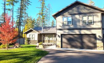 Highlights of this property include a private hot tub, garage parking, a cozy fire pit, and a game room equipped with a 75" Smart TV. As you approach the neighborhood, towering pine trees evoke a quintessential Montana ambiance.