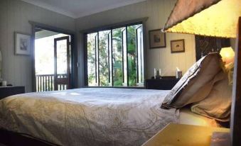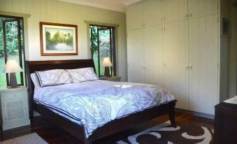 The cottage is unique and beautiful, built with love by its boatbuilder owner, his sons and wife. Hardwood floors, full kitchen and living room are equipped with all the necessities for your comfort. The open planned living room has a range of books, 32 inch HDTV and a DVD player, and wifi. This leads to the dining room, with a dining table seating for six. The kitchen has 5 burner gas stove, electric fridge, and a range of appliances. The large bedroom has a queensize bed and the french doors open to the balcony and incredible views over the valley. The bathroom features a jacuzzi with large windows opening out to rainforest views. Being run on solar power and rain water, the system is fully automated offering full electricity and ample water, however, the usage needs to be respected. The deck on the front of the cottage is extensive, some of which is covered and some being open. Be at one with nature, as you experience an open Avery to all the music of the rainforest. Under covered deck, a is a lovely daybed, which can be used for sleeping or lazy afternoons. There are also two lounge chairs to enjoy the views and to relax. We also have a dining table with settings for four. This leads to an open deck and plunge pool where you can see the beautiful valley as you relax in the water or sun lounges. At night view the stars like you have never seen them before.
