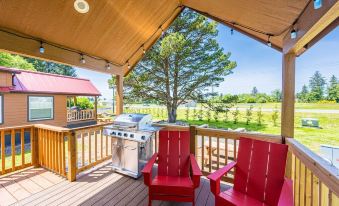 But the true highlight of our tiny home lies outdoors, where you'll find your private oasis awaiting. Gather around the large wood-burning fire pit for evenings spent swapping stories under the stars or fire up the barbecue grill for a sizzling cookout with friends and family. With a picnic table and ample seating, there's plenty of room to dine al fresco and soak in the serene surroundings.