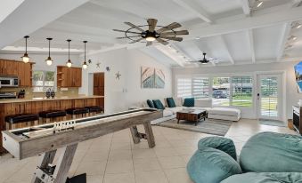 Indoors, the delights continue with a spacious and stylish interior designed for both relaxation and entertainment. Challenge your friends and family to a friendly game of shuffleboard or test your aim with a game of darts. The open-concept layout creates a seamless flow between the living, dining, and kitchen areas, perfect for socializing and making memories together.