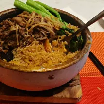 Номер просторный и светлый, постельное белье очень комфортное, а ночной вид из окна просто прекрасен. Что касается еды, рис в каменном горшочке с грибами эноки и тонко нарезанной говядиной был восхитителен. Говядина была отменной, а в сочетании с кимчи — это просто объедение! По соотношению цена-качество – отличный вариант, гораздо лучше, чем заказывать еду на вынос.