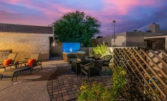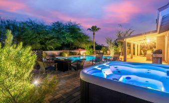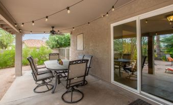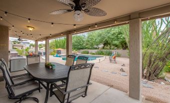 Relax and enjoy the peace & tranquility of your own pool, fire table, hot tub, yard games & covered patio. Close to the famous Fountain, dining, golf, bike trails, hikes & shops. Dining inside or out under the café lights or viewing the milky way from the cozy firepit & hot tub. Fountain Hills is considered a dark sky community so stargazing is ideal. Primary features king pillowtop bed, easy access to hot tub or soak in private jetted tub. 2 other private guest rooms. 2 car garage. Pool can be heated in spring to 82-84 degrees for additional $40 per day. Winter depends on how cold it gets over night, 75 if cover is replaced each night.