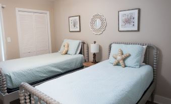 Ocean Mile E6 is located on the East End of Saint George Island. This unit has three bedrooms, a bunk room and three full bathrooms. The first level consists of the living room, kitchen, and dining area. A bedroom with two twin beds and a neighboring bathroom are also on the first floor. The second floor has a queen bedroom with a neighboring bathroom, a master bedroom with a neighboring bathroom, and a washer and dryer. The bunk room is located beside the master. Ocean Mile E6 has under house parking available for two vehicles. Extra parking is located along East Gulf Beach Drive.