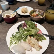 Завтрак: Ростки гороха в салате, французские тосты в десертной зоне и донбури с морепродуктами — мои любимые блюда дня. Кроме того, японское молоко не вызывает вздутия живота, поэтому его можно пить без опасений.