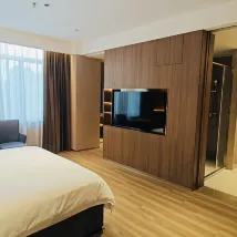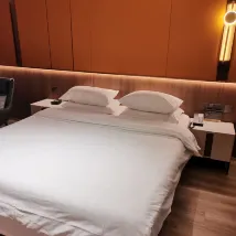 房間大小是滿意的,設施也是非常齊全的。服務跟其他評論提到的差不多,前台沒有迎接的,衞生方面這個床單被套不是很乾凈。離萬達廣場也就幾步路,適合吃完飯散步回來這樣。 忘了説了,那個b電視是真逆天,衹給了電視機的遙控器,沒給機頂盒的遙控器,這就導致一個什麼問題呢?電視經常放着放着出現要你選現在更新還是稍後更新,電視機遙控器根本選不了,衹能重啟,一來一回非常耽誤時間。找服務人員幫忙,他們叫來的人就拿那個機頂盒遙控器把更新取消了,但是他走了過後一倆小時又出現那個訊息把屏幕中間擋住,我請問呢?那為什麼不乾脆每個房間配一個機頂盒遙控器方便一下你們的顧客呢。