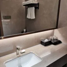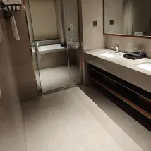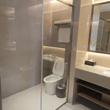 相比萬達附近的酒店價位稍高,前一天住的一個酒店室內全部是全自動的包括馬桶,價位277,環境非常安靜。這裏的馬桶座上竟然有很多劃痕!浴室水龍頭冷熱水標記竟然是反的,放了半天水怎麼都是冷的,換了一個方向才發現反了。