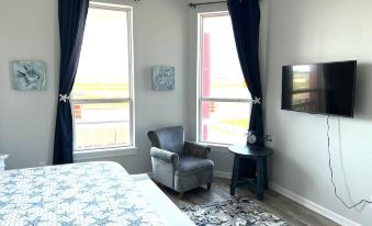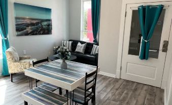 The private entry opens into your vacation home in a very spacious yet cozy atmosphere with accents and décor that will relax your senses with soft beach inspired pastel colors and themes. The living room will invite you and your guests to laugh and relax in style and comfort with large windows and tall ceilings. The seating area allows for both causal conversations and to comfortably watch a movie on the TV. The living room couch pulls out to provide a queen-sized sleeping accommodation if needed. The living room is a clean and contemporary design that connects seamlessly into the dining room and kitchen as a modern open space concept. The fully stocked kitchen features appliances, utensils and everything you need to serve up refreshments, snacks, appetizers or make a home cooked meal. The bathroom features a tiled built-in-shower with a cubby for storage. One Large Towel and One Washcloth included per guest. One comfortable bedroom with king sized bed for privacy and a restful night sleep so you can be ready for the next adventure each and every day you spend on the island.