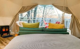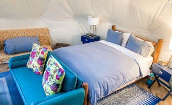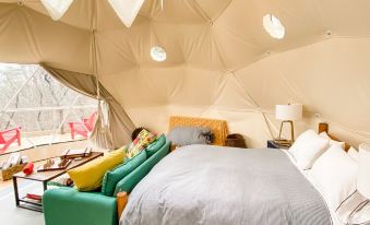 Nestled in native blueberry bushes, high above a beautiful ravine and surrounded by pine trees. This Geo-Dome overlooks the Palmaghatt Kill Stream from its wide windows and beautiful deck. Equipped with a log queen bed, skylight above, super soft linens, cozy blankets, and a down comforter in the colder months. Included are towels, a mini fridge, Keurig, coffee, charcoal grill, bluetooth speaker, lantern, umbrellas, a mini library of books and water jug 1 gallon for drinking. If you are coming as a family, one additional children's mattress on the floor may be added.