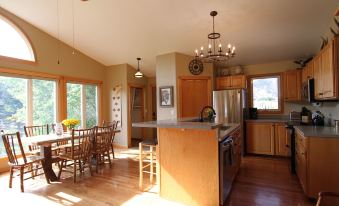 Kitchen: The fully-stocked open kitchen has everything you will need including updated appliances, microwave, drip coffee maker, toaster, crock pot, and a large pantry for your groceries. After a day spent exploring Yellowstone Park, you can kick off your hiking boots and gather around the island and recount your adventures while dinner is underway. If the cool evening is too much to resist, take the cooking out to the deck and soak in the river vibes as you cook on the gas grill. The local market is just 5 miles away and offers a wide array of local and gourmet items in addition to the normal staples, so you will be all set for your stay.