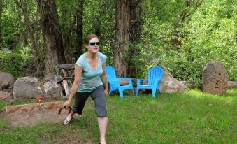 Where the driveway crosses the creek, there is a small field on one side (for playing ball and running around), and on the other side an open area with horseshoes and creek access. This area is open to guests as well as neighbors (but you will usually have the space to yourself). There is no fishing at the creek (but there are several rivers in the area that boast world-class fly fishing). In the spring the creek will be much higher, slowing to a meandering stream in the summer.