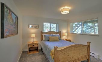The master bedroom has a king bed, TV, generous closet space and private bathroom featuring a deep soaking tub. Three additional bedrooms and a shared bathroom on the lower level offer ample space for everyone. One charming room is lined with windows and has twin bunk beds, making it ideal for the kids in the family. The other two bedrooms are furnished with queen beds.