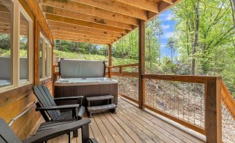 ✔ Three covered decks featuring hot tub, log rockers, living area and a picnic table