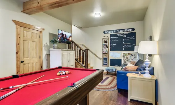 This 2,100 sf cabin sleeps 10 in 3 King Beds with one bedroom on each level, a foldout queen, foldout twin, and twin day bed. There are 3 full baths which include a soaking bathtub on the main level and a walk-in shower on the lower level. The two-sided wrap around covered porch invites you to sit and relax with a book, wind down in the hot tub, or visit on the front porch in the comfy rockers all while enjoying the view of the Smokies. The game room includes a pool table and washer/dryer. The roomy loft has a s bed great for reading and lounging and a great place to play games. Get the most restful night's sleep in the comfy king size beds. This home sleeps ten and is great for families and friends to enjoy time away.About pets:No pets allowed.About checkOut:Check out before 10:00 AM.About children:Children allowed: ages 0-17.About checkIn:Check in after 3:00 PM.About smoking:Smoking is not permitted.About minBookingAge:Minimum age to rent: 26.About events:No events allowed.No fireworks including gender reveals.