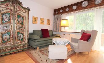 Seefeld: Located in the immediate vicinity of the mountain train "Rosshütte", cosy apartment block "Am Birkenhain". In the resort, 500 m from the centre, in a central, quiet, sunny position, 800 m from the lake, 400 m from the skiing area. For shared use: lawn for sunbathing. Garden furniture. In the house: reception, WiFi, table tennis, trampoline, lift, storage room for bicycles, storage room for skis, central heating system. Bread roll service and beverage service. Motor access to the house. Parking at the house. Shop, supermarket 500 m, restaurant 200 m, pedestrian zone 500 m, 5 minute walk to the centre, bus stop 100 m, railway station 500 m, indoor swimming pool 800 m, bathing lake "Wildsee" 800 m. Golf course (9 hole) 500 m, indoor tennis centre 1 km, sports centre 1 km, skisport facilities 400 m, ski bus stop 50 m, cross country ski track 500 m. Well-known ski regions can easily be reached: Rosshütte 400 m, Gschwandtkopf 1.5 km. Please note: ski bus (free of charge). Use of the washing machine on request with the person in charge. 1-room apartment 33 m2 on 1st floor. Renovated, rustic and stylish furnishings: living/dining room with 1 double fold-away bed and cable TV (flat screen), radio. Kitchen (oven, 3 ceramic glass hob hotplates, electric coffee machine, Capsules for coffee machine (Tassimo) extra). Shower/WC. Balcony. Balcony furniture. Facilities: Internet (WiFi, free). Please note: non-smokers only. Maximum 2 pets/ dogs allowed. Smoke alarm.