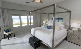 The master bedroom suite has a four poster king bed, panoramic views of the beach and ocean and direct access to the magnificent patio.