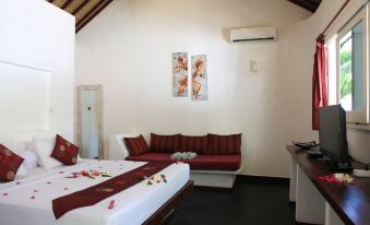 За свои деньги - это топ! Две виллы не новые, но просторные и чистые. До пляжа с черепашками 40 метров от номера. Черепах и других рыб полным полно! Обслуживание и в номере, и на пляже (где почти никого нет), и у бассейна (в котором кроме вас никого нет) отличное. Неплохая кухня с претензией на итальянскую. Кокосы, фреш на выбор, вода, хорошее вино. Паста точно как в Италии! Очень дружелюбный персонал! Отлично для заезда двум парам! Можно и с детьми. Расположен в 20 мин хоть бы от центра (пристани). Поэтому нет толпы и суеты.