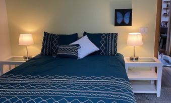 Upstairs on the first level, you have the main living room, a dining table, and a kitchen with bar seating. There is a washer and dryer of BOTH the ground and first floor kitchens. There are there are two bedrooms on the first level, one with an en suite bathroom and one with a bathroom right outside the door (shared with the living room area). On the third floor is the king bed room and ensuite bathroom, so the third floor is just the king room, so tons of privacy with your own staircase to your room.