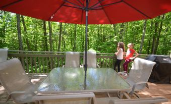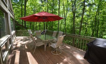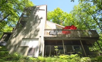 Beautiful multi-lodge style home nestled in a wooded setting. Welcomes 10 guests. Fireplace. Large outdoor deck.