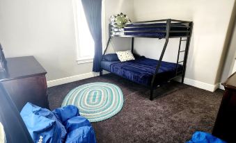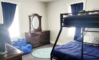 2 inviting bedrooms featuring a queen bed, full bunk bed, and twin bed