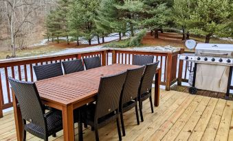 Unwind on the porch swing or rocking chair on the covered front porch that runs the length of the cabin. Then fire up the five-burner propane grill on the back deck to enjoy a meal together around the 8-person deck table that overlooks the wooded back yard. Relax in the seven-foot hot tub on the back patio located just outside the walk-out basement. Set up a game of cornhole with the provided boards and bags or take a walk around the wooded grounds to check out the property's creek.