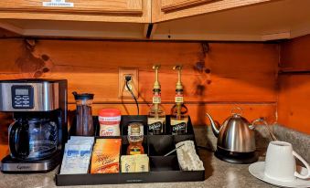 Sip a drink from the hot beverage bar in the kitchen that includes a 12-cup drip coffee maker and an electric kettle to make an assortment of provided hot beverage options, including ground coffee, tea bags, hot cocoa, and hot cider. We provide a coffee grinder for guests wanting to bring their own beans to grind.