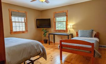 The cabin has three bedrooms and two bathrooms. The first-floor master bedroom with attached bathroom features a king bed, walk-in shower, and jetted tub. The second-floor rooms each feature a king and a twin. A full bathroom with a tub/shower combo is located off a short hall between the second-floor rooms. The larger of the rooms also includes a small desk.