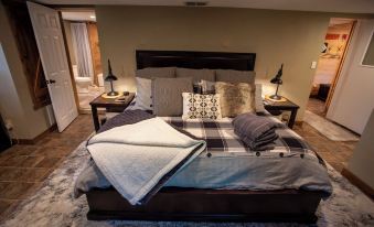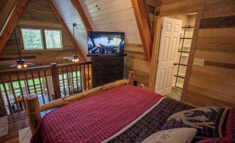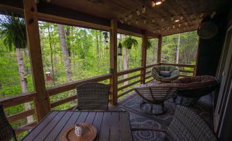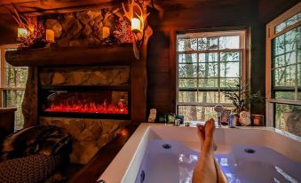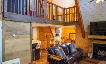 Secluded, yet not far off the beaten path, Hickory Hideout has three levels and offers you two on suites where we made every effort to make this cabin more than just home away from home. Each bedroom is furnished with a 43” Smart TV and plush queen beds for you relaxed and at ease after a day of fun. The main level includes the kitchen, half bath, laundry with front load washer and dryer, and a main living area. The living room is stately and inviting with its marvelous cathedral ceilings and double sliding glass doors for picturesque views of the secluded mountainside and is situated with fine leather furniture, fur rug, fireplace and 50” Smart TV. The lower level encompasses a space that can be used as a private master suite or shared living space including a bedroom, full jack and jill bath with tile surround shower and living room with a full size Lazy-boy sofa sleeper. The open air covered deck is off the main level with areas for lounging and dining. There is also a partially screened in patio in the lower level that leads to the outdoor fire pit where you can enjoy the serenity of a warm, crackling fire under the illumination of the ambient lighting.