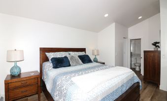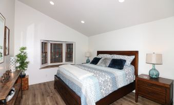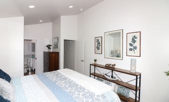From the living room, a hallway leads to the master suite. At the opposite end of this hallway, you'll find a secondary bathroom and bedroom. The master suite boasts a king bed and ample space for reading and relaxation. The master bathroom is a full bath with a shower and a single sink. Down the hall to the right is another full bathroom, equipped with a bathtub. The secondary bedroom features a king bed and an oversized walk-in closet. Additional storage is available in the garage, which is accessible through the courtyard. You'll thoroughly enjoy this allergy-friendly space!
