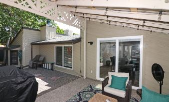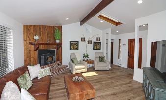 As you enter the home through the courtyard gate, you'll step into the welcoming living room area, complete with a cozy fireplace and a large Smart TV. This living space seamlessly flows into an open dining room that comfortably seats six guests. The open kitchen, fully stocked and featuring brand-new appliances, offers the perfect setting for meal preparation and engaging conversation. Sliding glass doors from the kitchen lead to a covered outdoor living area, furnished with comfortable seating and a propane grill. The private fence ensures a peaceful outdoor experience.