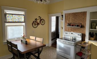 Go back in time as you enter this old Victorian home. All new contemporary yet comfortable decor and furnishings that complement the charm of the original features like the hardwood floors, wall coverings, and built-in-place cabinets! Bedrooms feature vintage lighting, full size closet, and Queen beds. The living area has a comfortable sofa and loveseat and a Smart television with Roku. Enjoy the eclectic collection of antique items including an old fashion radio. The parlor room has a sofa sleeper for privacy and acts as a third bedroom. The bathroom has everything you might need including a walk-in shower, hairdryer, and unique ceiling decor. The kitchen is equipped with a farm sink, stove/oven, microwave, k-cup and drip coffee makers, toaster, mixer, all cookware and dinnerware. Enjoy the spacious outdoor living area next to the off-street parking. You should only need to get a few groceries and personal items!