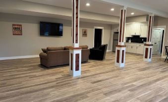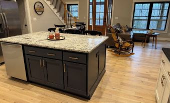 Kitchen Utensils/Amenities: spoons, spatulas, whisk, can opener, jar lid opener, wine bottle opener, vegetable peeler, batter spatulas, scissors, tongs, bottle opener, apple slicer, basting brush, measuring spoons/cups, large measuring cups, ladle, spaghetti/pasta spoon, pizza cutter, colander, muffin pan, baking sheets, Cooling rack, cutting board, nesting bowls, Pyrex casserole dish 11x13 & 8x8 with lids, pots with lids, large soup pot, many skillet options with lids, roasting pan, pizza stone and pan, knife block set, forks, knives, spoons, meat thermometer, grill tools, pot holders, dish cloths and towels, plates, bowls, mugs, glasses, silverware and storage containers.About pets:No pets allowed.About checkOut:Check out before 11:00 AM.About children:Children allowed: ages 0-17.Space is great for multiple families with kids..About customRules:You are not permitted to access the cart path or private boat dock nor park your boat there per Nolin Lake Corps of Engineers Rules..No smoking, vaping, cigars, pipes, electronic cigarettes or any other kind of smoking allowed and no explosives, shooting or weapons/drug use.,Please do not park or drive through the grass to avoid damage to lateral lines and septic and no flushing anything but 1 ply toilet paper down toilets.About checkIn:Check in after 4:00 PM.About smoking:Smoking is not permitted.About minBookingAge:Minimum age to rent: 18.About events:Events allowed: family gatherings and birthday parties.Maximum event attendees: 20.