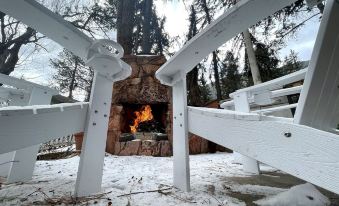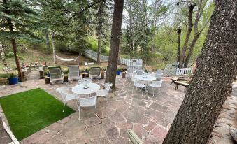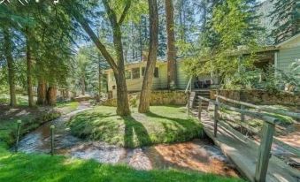 1930's luxuriously updated and remodeled, with high-end finishes. "Creekside at my Father's House" is a beautifully updated 5 bedroom 3 bath house and guest house (attached by a stone carport original to 1930's design). The property includes huge creekside stone patios with outdoor fireplace and waterfalls, privacy, rare large fenced property yet right in town-.short walk to the town center, attractions, hiking, biking out your door-- tennis, basketball and seasonal heated swimming one block away. Main house sleeps 6 in 3 private bedrooms- two full bathrooms. Guest house sleeps 4 in 2 private bedrooms and full bathroom -there is a covered stone carport between the two, original to 1930's design. Large common areas: kitchen, dining, living and family rooms along with outdoor living spaces, with plenty of privacy too-- a rare and big plus!