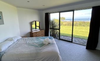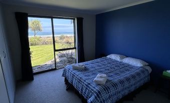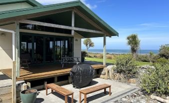 This large 5 bedroom home is very comfortable with 3 Queen bedrooms facing the sea. 1 with an ensuite. 2 other bedrooms have 2 single beds in each. There are 2 large living areas that face the sea. Both of these have televisions with full Sky TV. Sliding doors can separate these areas. One is a lounge and the other is a large tiled dining area including the large kitchen. 3 sets of bi-fold doors open up to outdoor concrete and timber decking areas. All this with views to the sea that is 150 metres to the seas edge. It offers a relaxed environment perfect to enjoy the wonderful views to the west and south. The BBQ and outdoors furniture is set up to enjoy those very surroundings. While so close to enjoy the great bush walk of the Point Elizabeth track. Plenty of space for car parking safely off the road.