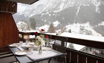 Residence "Chalet Abendrot apARTments". In the centre. In the house: reception, lounge, WiFi, table tennis, billiard table, playroom, lift, storage room for skis, central heating system. Pre-arrival grocery service. In Winter: please take snow chains. Communal covered parking (extra), public parking 200 m extra. Shop 400 m, restaurant 10 m, bus stop "Firstbahn" 80 m, railway station "Grindelwald Dorf" 800 m, outdoor swimming pool 2.5 km, indoor swimming pool 600 m. Golf course (9 hole) 2 km, tennis 1 km, minigolf 400 m, sports centre 600 m, mountain railway 800 m, gondola lift 80 m, ski rental 50 m, ski bus stop 80 m, cross country ski track 1 km, children's playground 600 m. Well-known lakes can easily be reached: Thuner-/Brienzersee 18 km. Please note: The owner does not accept any groups. Ski bus (free of charge). Neighbourhood highly sensitive to noise. Quietness and good behaviour expected. Indian restaurant "Golden India" in the house. The apartment house, built in chalet style, offers a youth room, a children's playroom, a garage (parking space CHF 98.00/week, reservation on arrival). Modern-rustic and cozy apartments, most with a spacious balcony or terrace and a wonderful view of the mountains. Please note: limited number of garage spaces. Pre-reservation not possible. Garage height and width: 12 parking spaces 2.09x2.06 m, 15 parking spaces 1.65x2.06 m. Max. 2000 kg. 2-room apartment 45 m2 on 3rd floor, south facing position. Living/dining room with cable TV (flat screen). Exit to the balcony, south facing position. 1 double bedroom. Open kitchen (oven, 4 ceramic glass hob hotplates, toaster, kettle, electric coffee machine). Bath/WC. View of the mountains and Eiger. Facilities: hair dryer. Internet (WiFi, free). Please note: non-smokers only. Maximum 1 pet/ dog allowed. A fondue set (meat or cheese) and a raclette oven can be borrowed from reception.