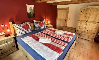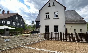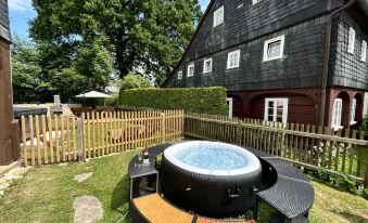 Historical 2-family house, 2 storeys, built in 1790, renovated in 2022. 500 m from the centre of Großschönau, 12 km from the centre of Zittau, 30 km from the centre of Löbau, 20 m from the river. For shared use: natural state property (fenced). Private: hot tub. Bread roll service. Shop 500 m, supermarket 200 m, restaurant 400 m, bakery 300 m, bus stop "Großschönau Weinhaus" 700 m, railway station "Großschönau Bahnhof" 1.5 km, outdoor swimming pool 1.5 km, bathing lake "Olbersdorfer See" 13 km. Walking paths from the house 5 m, ski lift 4 km, ski school 4 km, cross country ski track 4 km. Well-known ski regions can easily be reached: Waltersdorf 4 km. Well-known lakes can easily be reached: Olbersdorfer See 13 km. Please note: Additional accommodations can be booked. "Frushi", 3-room apartment 126 m2 on 1st floor. Rustic and cosy furnishings: upper floor: (steep stair) living/sleeping room, Low door height 180 cm ceiling height 190 cm with 1 double sofabed (140 cm, length 200 cm), Scandinavian wood stove, dining table and satellite TV (flat screen), DVD, DVD collection available and electric heater. 1 room, Low door height 170 cm ceiling height 190 cm with 1 double bed (180 cm, length 200 cm), satellite TV (flat screen). 1 room, Low door height 180 cm ceiling height 190 cm with 1 bed (90 cm, length 200 cm), 1 double bed (180 cm, length 200 cm). Kitchen (oven, dishwasher, 4 ceramic glass hob hotplates, toaster, kettle, microwave, electric coffee machine) with dining table, ceiling height 240 cm, Low door height 175 cm, satellite TV (flat screen). Shower/WC, sep. WC, Sauna. Gas heating, Electric fireplace. Patio, garden 250 m2. Terrace furniture, barbecue (portable), deck chairs. Facilities: washing machine, safe, iron. Internet (WiFi, free). Computer (free). Parking (2 cars). Please note: non-smokers only. Maximum 2 pets/ dogs allowed. Private entrance, smoke alarm. Private garden area. Desk with computer and printer. Infrared sauna. Outdoor hot tub (open April-October).