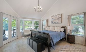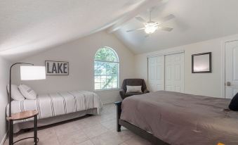 The master bedroom, with a king-sized bed and a fold out couch, is located just off the kitchen. You’ll be able relax in comfort in this oversized room with an amazing view of the lake. The master also offers a large master bath with a standup shower & a separate large tub. Two other bedrooms are also on the main floor. Both have queen beds & one with a couch bed that offer a great night’s sleep.