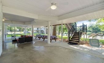On the ground level you’ll find a covered sitting area that has two picnic tables, a ping pong table & a large screen TV. You won’t lack for things to do even if it rains!