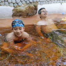Поскольку дети не хотели уходить после игры, я спросила на стойке регистрации, можем ли мы пойти в горячий источник после выписки. Сотрудники стойки регистрации задержали наш выезд до 14:00. Когда я уходил, мисс Зилинг на стойке регистрации дала мне несколько конфет и бутылку минеральной воды, но она сказала, что минеральная вода непригодна для питья и ее можно использовать только для маски для лица или для посадки цветов.