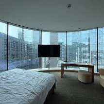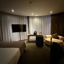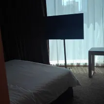 При заселении нам сразу же повысили категорию номера до люкса. Номер был очень просторным, с огромными панорамными окнами от пола до потолка, из которых открывался прекрасный вид. В номере было всё необходимое, и хотя обстановка немного устарела, всё было безупречно чисто и аккуратно. Впечатления от проживания были на высоте! Отель удачно расположен: рядом развитая инфраструктура и отличная транспортная доступность. Определенно рекомендую к проживанию!